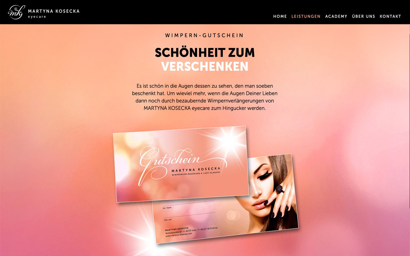 Martyna Kosecka – die neue Coco Chanel der Beauty-Branche – hat sich mit ihrem Geschäft auf Wimpernver-längerungen bester Güte spezialisiert. Echte Eyecatcher von ausgezeichneter Qualität und Haltbarkeit. Für das Kölner Beauty-Startup zeichnet SCHUPPAN CREATIVE SOLUTIONS nicht nur für Branding- und Markenenkommuni-kation verantwortlich, auch was die Unternehmens- und Geschäftsfeld-entwicklung betrifft.